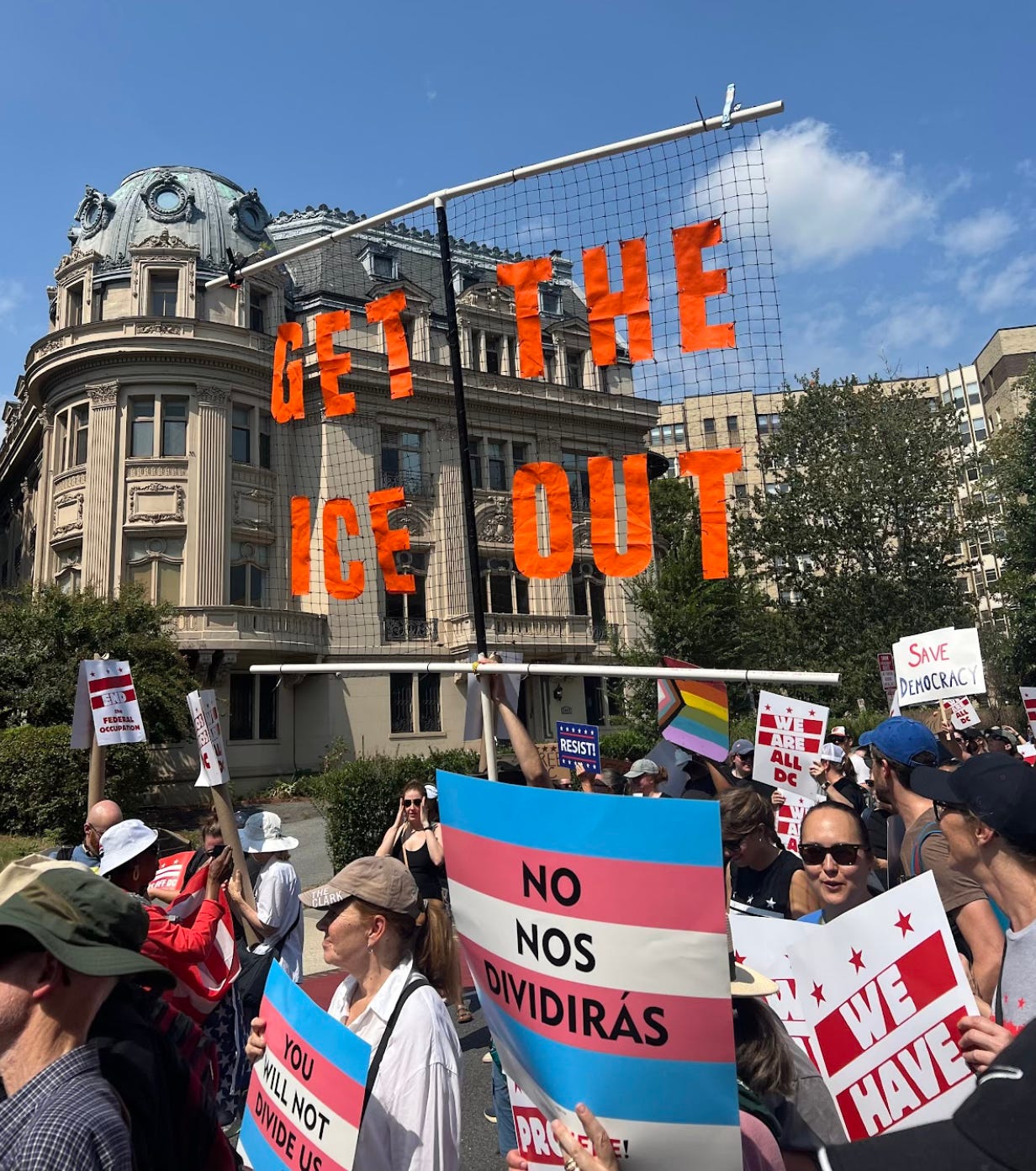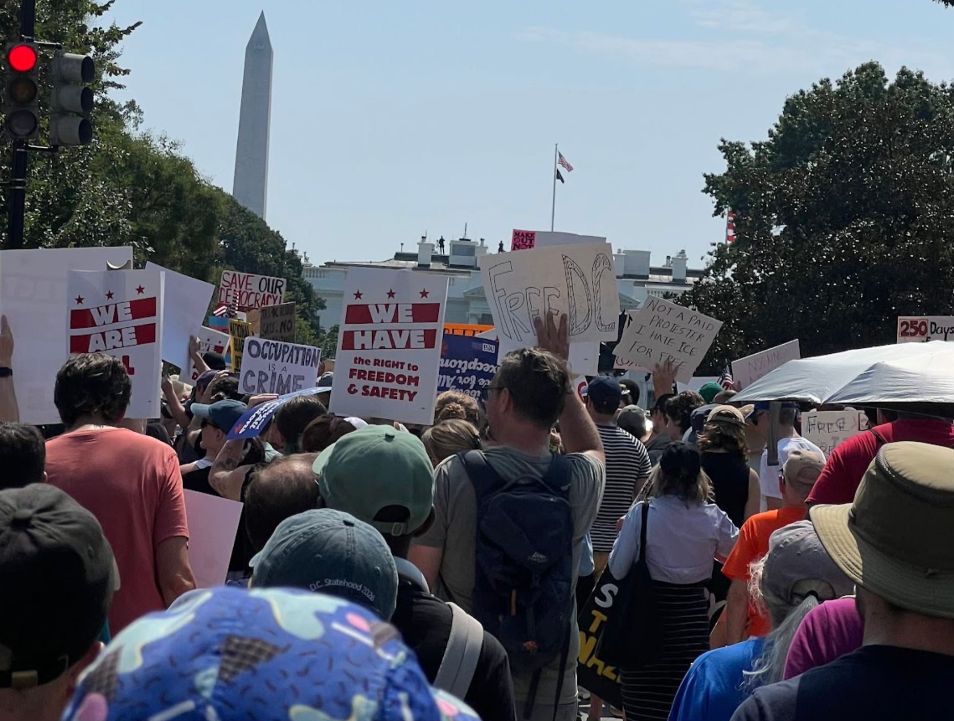 “Behind a bright red banner reading ‘END THE D.C. OCCUPATION’ in English and Spanish, protesters marched over two miles from Meridian Hill Park to Freedom Plaza near the White House to rail against the fourth week of National Guard troops and federal agents patrolling D.C.’s streets,” the AP reported. The demonstration, led by a diverse roster of organizations that included the ACLU, Bend the Arc: Jewish Action, CASA, Greenpeace USA, SEIU, Veterans for Peace, and the Washington Interfaith Network, “was perhaps the most organized demonstration yet against Trump’s federal intervention in Washington.”