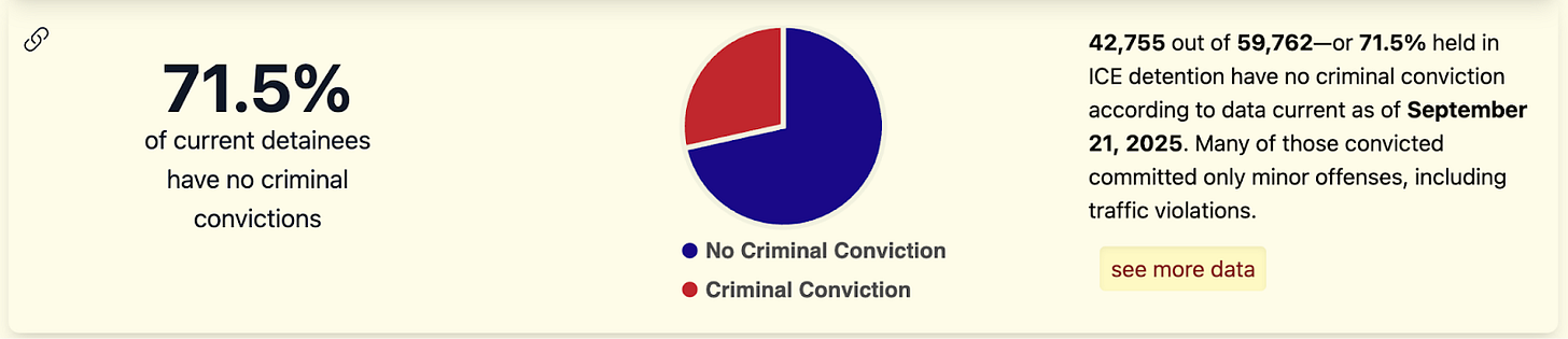 “More recently, Americans have been watching videos of ICE tackling a young mother, tear gas being used in a Chicago residential neighborhood, and the smashing of car windows. Have some of these raids gone too far?” asked 60 Minutes correspondent Norah O’Donnell. “No. I think they haven’t gone far enough,” Trump responded before launching into a diatribe about the Obama and Biden administrations. “You’re okay with those tactics?” O’Donnell interjected. “Yeah, because you have to get the people out,” Trump replied, again launching into a fact-free rant claiming he’s targeting individuals who pose a risk to public safety. But according to TRAC Immigration, the vast majority of immigrants in ICE detention have no criminal record at all.